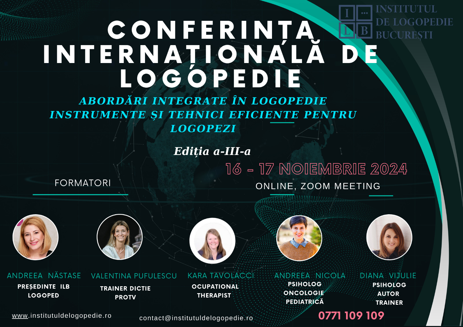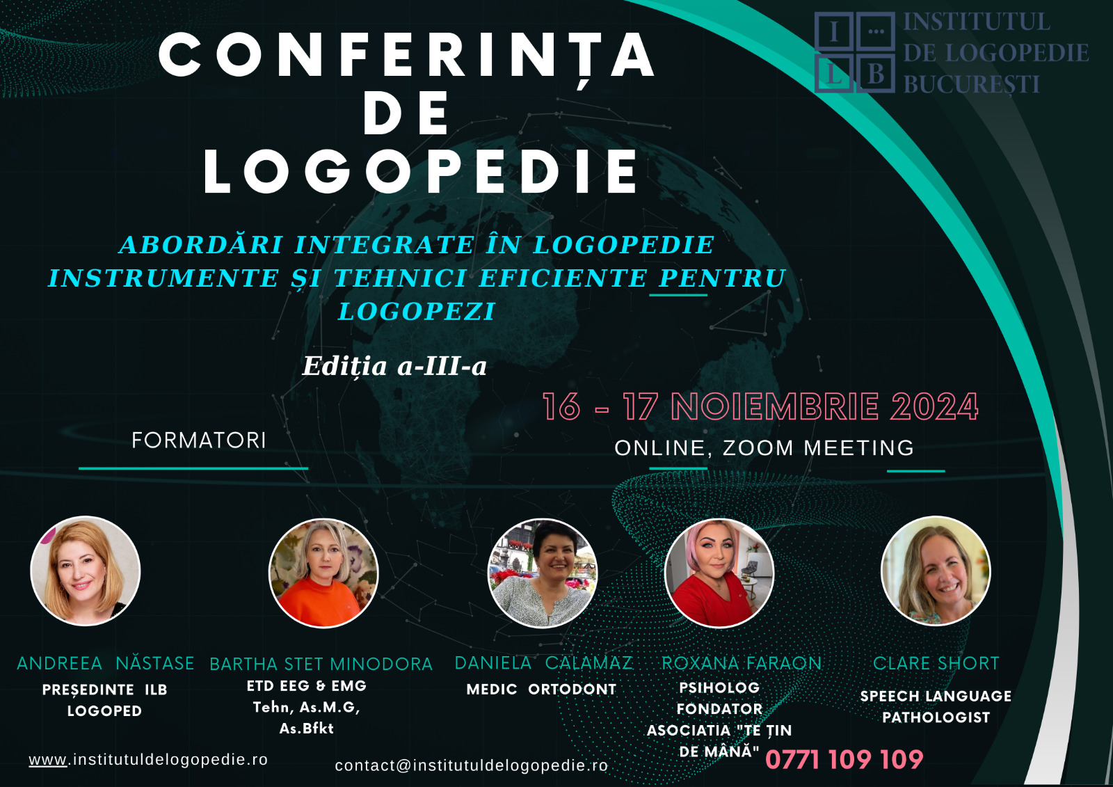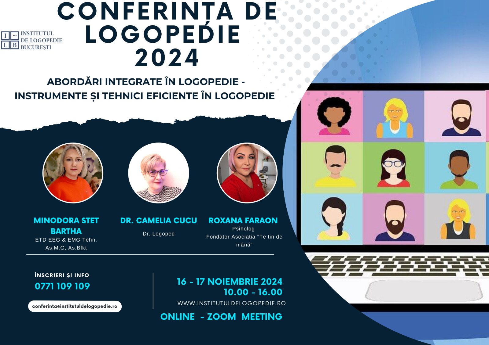 Conferinta de Logopedie “Abordări integrate în logopedie – Instrumente și tehnici eficiente pentru logopezi “ are loc în perioada 16 – 17 Noiembrie 2024 în România online pe Zoom Meeting.